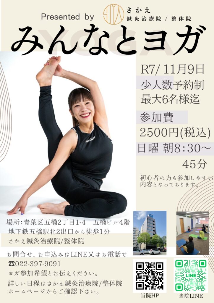 ご予約は当院LINE及びお電話022-397-9091、ヨガ参加希望とお伝えください。